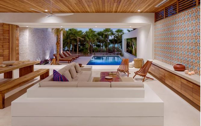 Specht Architects tarafından dizayn edilen bu tropikal tarz ev geniş ve ferah bir salon ile bahçedeki havuzun iç içe geçmesiyle göz kamaştırıyor. Havuz çevresindeki oturma alanları ve ahşap tonlar bu evi seçkin bir kategoriye sokuyor.