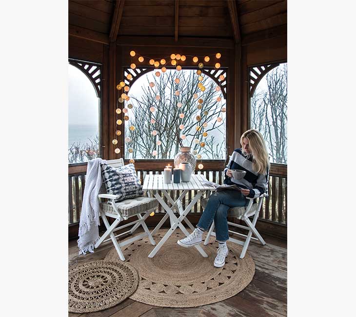 Sonbahar evde sıklıkla vakit geçireceğiniz bir mevsim ama bu demek değil ki tamamen evde olacaksınız. Bahçede, terasta veya balkonda yağmurun ve şekilden şekle giren bulutların keyfini çıkarmayacak mısınız? Kendinize açık havada keyifli bir köşe yaratın; en sevdiğiniz sıcacık battaniyeyi, hoş aydınlatmaları, kokulu mumları ve içecekleri alın, havanın tadını çıkarın.