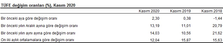 Ana harcama grupları itibarıyla 2020 yılı Kasım ayında azalış gösteren tek ana grup %0,19 ile eğitim oldu. Alkollü içecekler ve tütün ana grubunda aylık değişim olmazken, en az artış gösteren gruplar %0,12 ile haberleşme ve %0,80 ile sağlık oldu. Buna karşılık, ana harcama grupları itibarıyla 2020 yılı Kasım ayında artışın yüksek olduğu gruplar ise sırasıyla, %4,51 ile ulaştırma, %4,16 ile gıda ve alkolsüz içecekler ve %1,69 ile ev eşyası oldu.