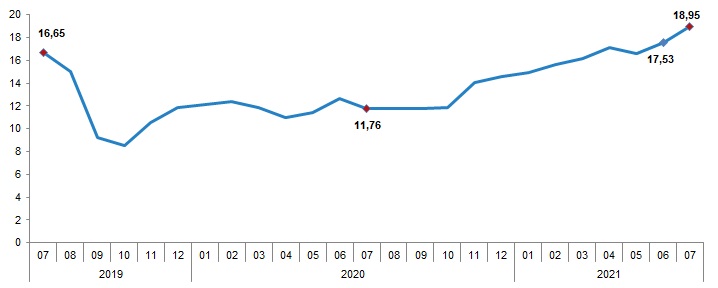 Tüik tarafından 2021 yılı temmuz ayına ait enflasyon rakamları açıklandı. Bu ekonomik veri aynı zamanda ev sahibi ve kiracıları da ilgilendiriyor çünkü kira zamları enflasyon verilerine göre belirleniyor. Temmuz ayında bir önceki aya göre %1,80, bir önceki yılın Aralık ayına göre %10,41, bir önceki yılın aynı ayına göre %18,95 ve on iki aylık ortalamalara göre %15,15 artış gerçekleşti. On iki aylık ortalamalar bir sonraki ay, yani ağustos ayında yapılabilecek maksimum kira zammını da bize söylüyor. Buna göre, ağustos ayında en fazla yapılabilecek zam %15,15 olmuş oldu.