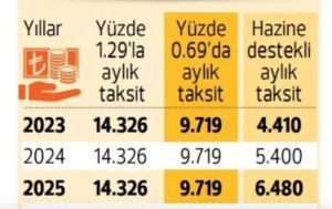 Projenin artılarından biri devletin ödemelere destek sunması. Hemen kısaca bundan da bahsetmek gerekirse, örneğin 1 milyon TL kredi kullanıldığı varsayılırsa, vatandaşlarımız ilk yıl yüzde 0.69 ile 4.410 TL taksit ödeyecek. İkinci yılda taksit 5.400 TL olacak. Üçüncü yılda 6.480 TL’ye çıkacak. Detaylı ödeme planına aşağıdaki tablodan bakabilirsiniz.